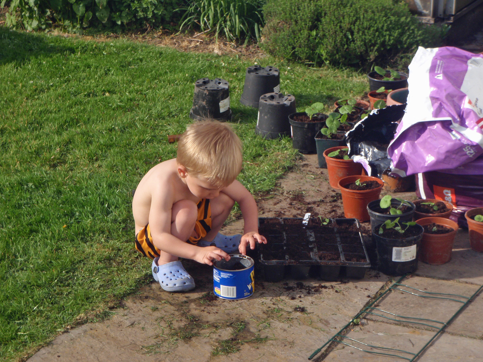 Luckily I had gotten all the baby plants out of the tray because Hank started stealing the dirt from the seed tray for his peanut can project.